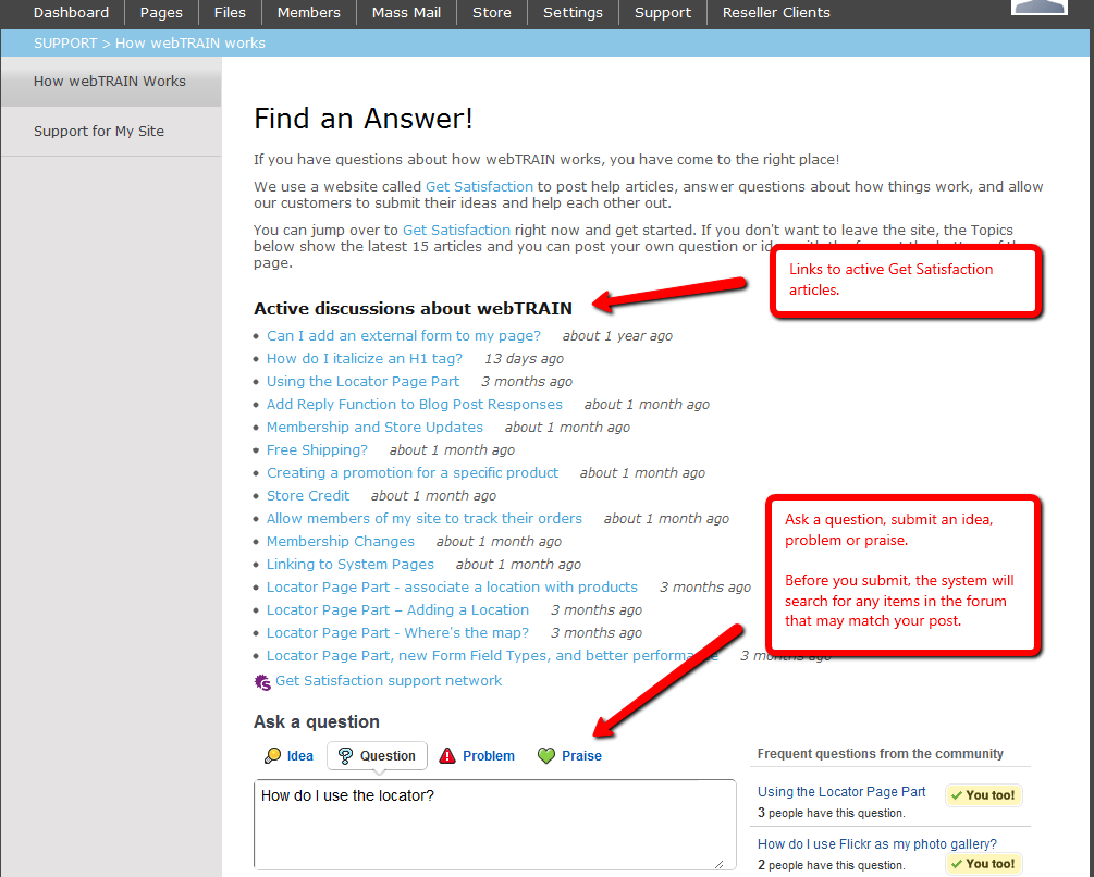 1. If you need help learning how to do something, our Get Satisfaction support forum is the place to go. We post helpful articles, webTRAIN updates, and ideas on the forum. You can search the forum, ask your own question, help other users, report problems, or let us know what we’ve done right.