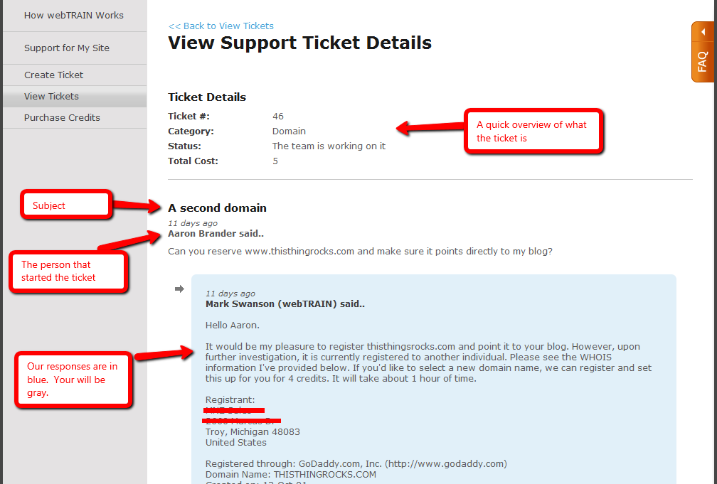 If you need us to take care of something for you, click on the “Get some help!” button. The first screen you see will show you how many credits you have, the date the credits will refill, and the 5 latest actions taken on any of your tickets.