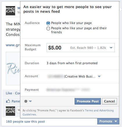At the same time the new algorithm was being put in place, Facebook began pushing another ad opportunity for businesses: promoted posts. This allows you to pay to advertise specific posts to your fan base and beyond.