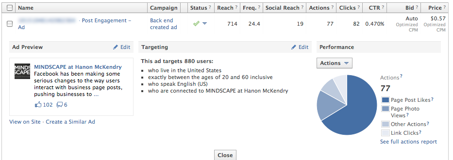 Now, let's go back and compare engagement metrics between the front end sponsored story ad and the back end post engagement ad.