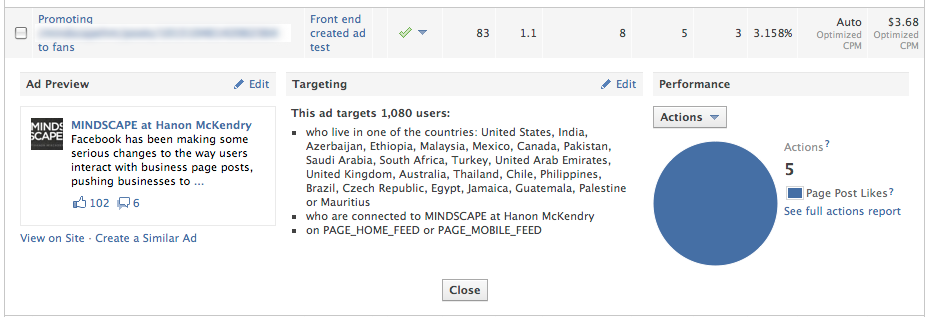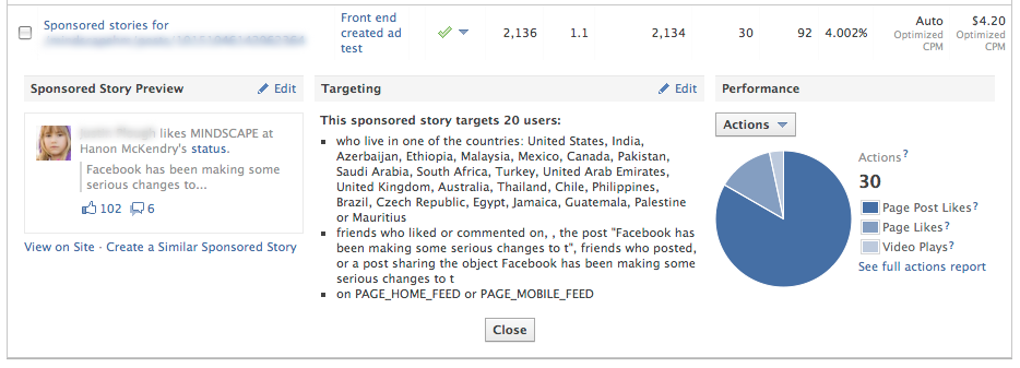 The front end created "sponsored story" ad, on the other hand, generated a reach of over 2,000, with 30 actions, 92 clicks and a big 4% CTR. Good, right?