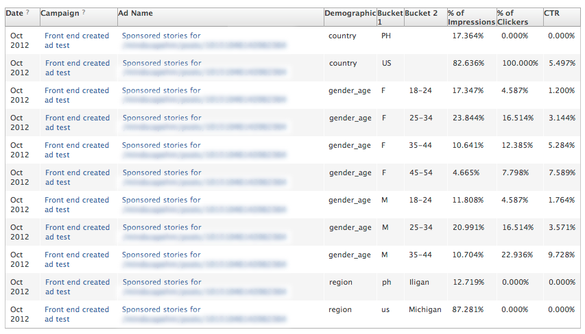 Now, look at the sponsored stories ad. Nearly 20% of the impressions were shown in the Philippines, with all remaining impressions confined to the US.
