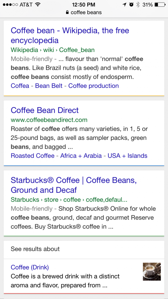 In the screenshot below, you can see an example of this change. Notice the label underneath the first search result that says “Mobile-friendly” Now, look right below it — Coffee Bean Direct does not have the mobile-friendly label.